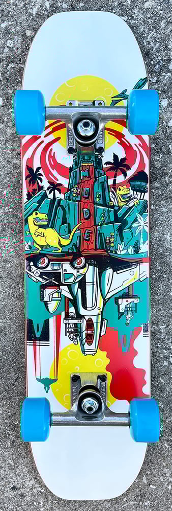 The board is a double-kick design pressed in the USA and hand-screenprinted by us. It measures 7.3 by 28.75, and has a modern symmetrical freestyle shape with a mild concave.